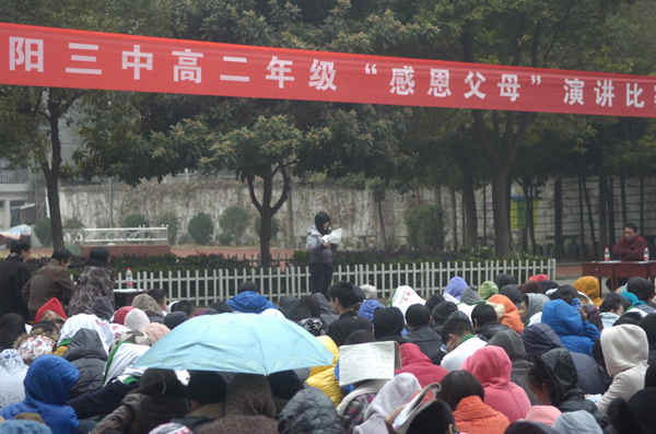 “父母之恩,水不能溺,火不能滅”。感恩節(jié)即臨,襄陽三中高二年級于11月20日下午組織學(xué)生,開展以“感恩父母”為主題的演講比賽。天氣似乎在考驗高二全體師生的意志和誠意,和著習(xí)習(xí)寒風(fēng),飄起了絲絲細雨。但全體師生仍然安守秩序,聆聽著18位選手激情澎湃的演講,會場上不時爆發(fā)出雷鳴般的掌聲。經(jīng)過激烈的比賽,17班季寧悅,1班張夢蝶,6班王春煜獲得一等獎,15班李爽健,11班木榮,16班孫援,5班王旭東,3班鄒潔,18班劉靜獲得二等獎,13班杜雙婧,2班陳高雁,14班李鴻鵠,8班陳潔,12班徐雨帆,9班趙錦琳,10班劉燚,4班操凌寒,7班劉谷雨獲得三等獎。