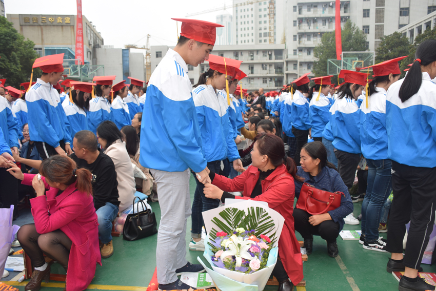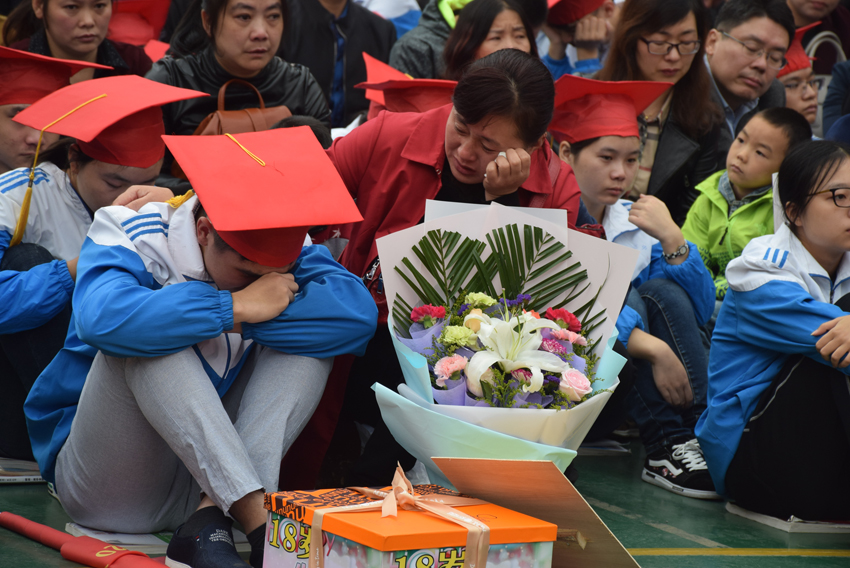 高三(20)班王子琪同學(xué)的現(xiàn)場(chǎng)發(fā)言——《感恩的心》將儀式推向了高潮。她選取了日常生活中父母呵護(hù)孩子的典型事例,有常年如一日給孩子送飯的,有父母生病瞞著孩子的,有高考一直守在考場(chǎng)外的,個(gè)個(gè)感人至深。講著講著,家長(zhǎng)們已是熱淚盈眶,學(xué)生更是淚流滿面。1