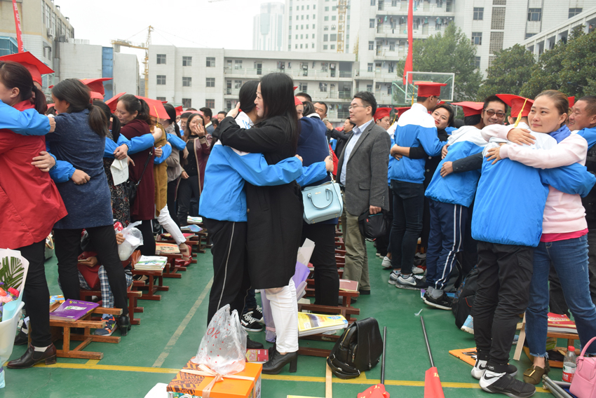 王子琪同學(xué)現(xiàn)場(chǎng)發(fā)問(wèn):“我們記得父母的生日是哪一天?在我們放月假享受父母伺候時(shí),有沒(méi)有想過(guò)父母辛苦勞累了多長(zhǎng)時(shí)間沒(méi)有休息了?當(dāng)我們犯錯(cuò)誤或成績(jī)下降時(shí),有沒(méi)有想過(guò)父母的心里是怎樣的酸楚呢?”學(xué)生們都一個(gè)個(gè)羞愧地低下了頭。她提議全體同學(xué)面向父母,摸摸父母粗糙的手,看看他們眼角的皺紋,又多了幾道?數(shù)數(shù)他們頭上的白發(fā),又增添了幾根……學(xué)生和父母相擁而泣,有的孩子已是嚎啕大哭。