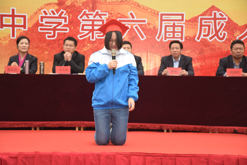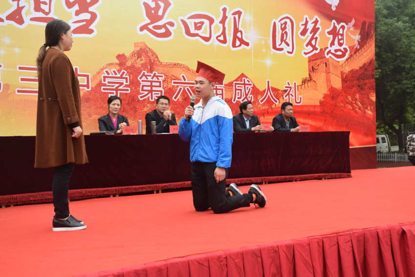 王子琪現(xiàn)場(chǎng)邀請(qǐng)同學(xué)到主席臺(tái)向自己的爸爸媽媽表露心聲,一下子涌上了幾十個(gè)同學(xué),爭(zhēng)搶著話筒向自己的父母表白。有的抒發(fā)了自己的壯志“請(qǐng)爸爸、媽媽放心,從今天起,我會(huì)加倍努力,不讓你們失望”;有的表達(dá)了對(duì)父母的感恩:“18年前,你們熬了幾天幾夜,欣喜地等來(lái)了我呱呱墜地,今天我要感謝你們,感謝你們給了我生命,感謝你們18年來(lái)對(duì)我的養(yǎng)育之恩”……