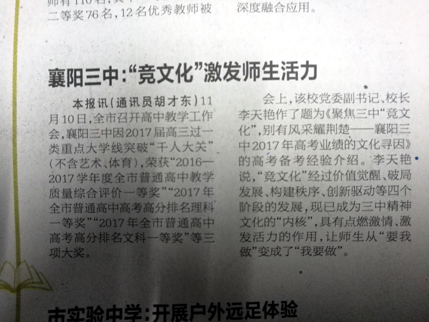 會(huì)上,該校黨委副書記、校長李天艷作了題為《聚焦三中“競文化”,別有風(fēng)采耀荊楚——襄陽三中2017年高考業(yè)績的文化尋因》的高考備考經(jīng)驗(yàn)介紹。李天艷說,“競文化”經(jīng)過價(jià)值覺醒、破局發(fā)展、構(gòu)建秩序、創(chuàng)新驅(qū)動(dòng)等四個(gè)階段的發(fā)展,現(xiàn)已成為三中精神文化的“內(nèi)核”,具有點(diǎn)燃激情、激發(fā)活力的作用,讓師生從“要我做”變成了“我要做”。