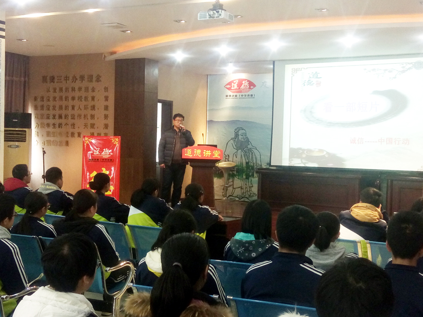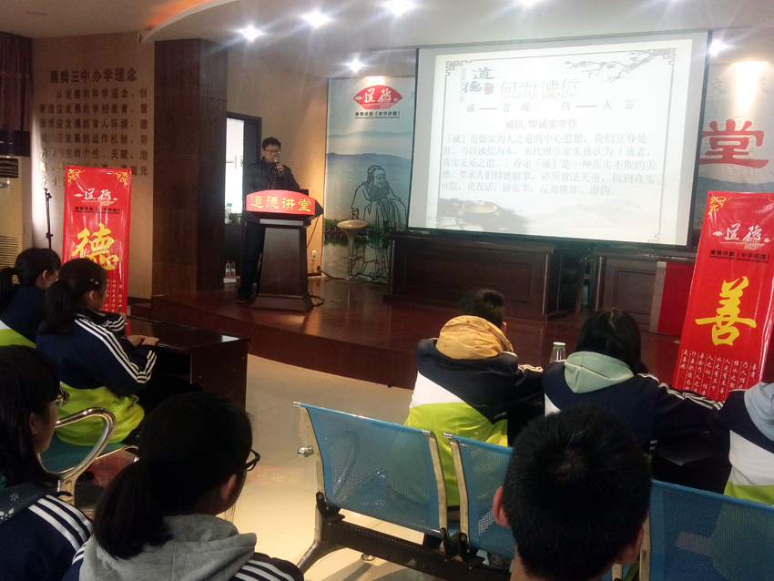 2017年11月24日下午,襄陽三中道德講堂在學(xué)校道德講堂活動(dòng)室開講,本期道德講堂的主題是“與誠(chéng)信為友”,主講人為高一(6)班班主任陳睿老師,整個(gè)活動(dòng)內(nèi)容豐富、環(huán)節(jié)完備。誠(chéng)信是做人的一種品質(zhì),是為人處世之本,是為人之德的核心。它不僅是中華民族的傳統(tǒng)美德,也是現(xiàn)代文明的基石,是處理人與人、人與社會(huì)之間的基礎(chǔ)性道德規(guī)范,陳睿老師希望通過本次道德講堂,教育每一位學(xué)生都能重信用、守承諾、講信譽(yù),忠誠(chéng)老實(shí),誠(chéng)懇待人,以信用取信于人。