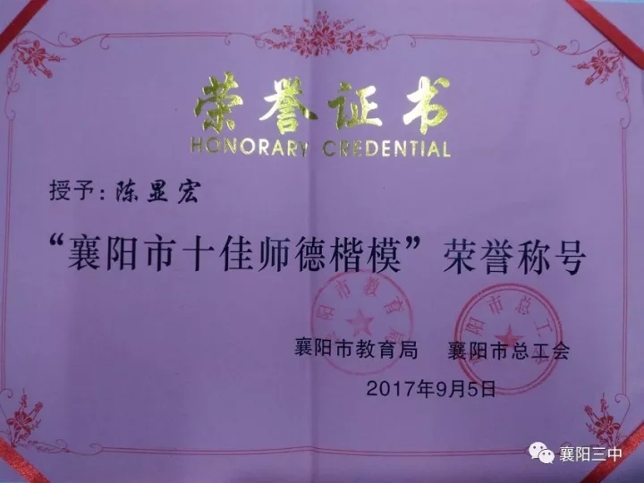 學(xué)校努力提升教師的獲得感,引導(dǎo)老師享受教育,做一名有幸福力的老師。學(xué)校抓好師德建設(shè),打造教師的“精神特區(qū)”,大力培養(yǎng)和倡導(dǎo)教師的責(zé)任意識(shí)和敬業(yè)奉獻(xiàn)精神,樹立崇高的人生觀、價(jià)值觀。充分挖掘?qū)W科帶頭人和骨干教師的資源,發(fā)揮其在教學(xué)活動(dòng)和教科研活動(dòng)中的示范和引領(lǐng)作用。引導(dǎo)青年教師樹立終身學(xué)習(xí)的理念,走“合格——升格——風(fēng)格”的成長(zhǎng)之路。2017年,學(xué)校名師輩出,何志平、陳芳被評(píng)為“襄陽市名師”,彭紅偉獲準(zhǔn)建設(shè)“襄陽市名班主任工作室”,陳顯宏榮獲“襄陽市十佳師德標(biāo)兵”稱號(hào),彭紅偉、孫愛勇被評(píng)為“襄陽市優(yōu)秀班主任”。