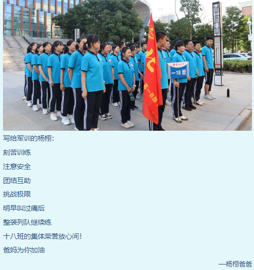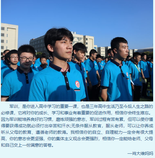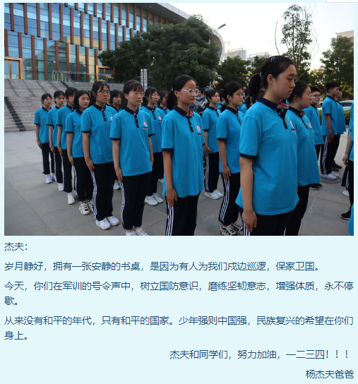 本次軍訓(xùn)以國(guó)防知識(shí)、校史校情、行為規(guī)范、隊(duì)形隊(duì)列為內(nèi)容,把學(xué)校教育與“軍訓(xùn)”教育緊密結(jié)合起來,采取課內(nèi)教育和實(shí)踐活動(dòng)相結(jié)合的方法,提高學(xué)生綜合素質(zhì),為把學(xué)生培養(yǎng)成合格高中生、合格公民及優(yōu)秀公民奠定基礎(chǔ)。對(duì)于軍訓(xùn)工作,高一年級(jí)的家長(zhǎng)們也表現(xiàn)了極高的關(guān)注。高一(18)班的部分家長(zhǎng)寫下對(duì)孩子的祝福和殷切希望,體現(xiàn)出廣大家長(zhǎng)對(duì)學(xué)校軍訓(xùn)工作的支持和肯定。